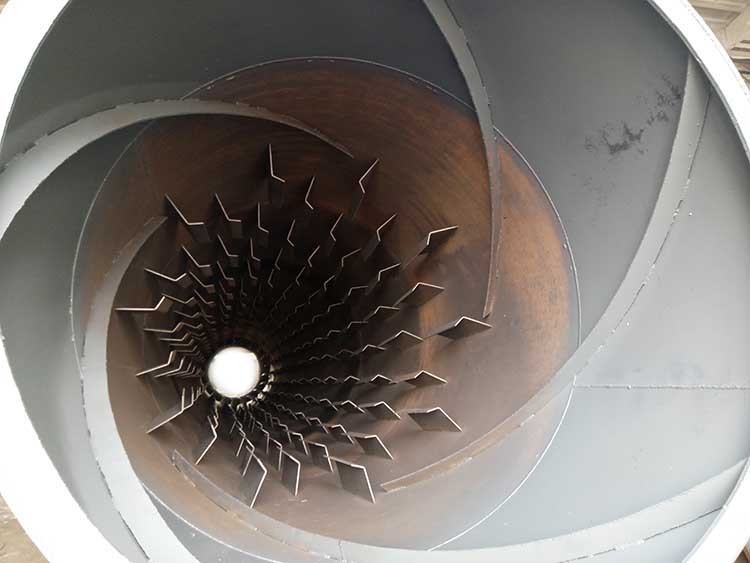 干燥的濕物料由皮帶輸送機(jī)或斗式提升機(jī)送到料斗,然后經(jīng)料斗的加料機(jī)通過(guò)加料管道進(jìn)入加料端。加料管道的斜度要大于物料的自然傾角,以便物料順利流入干燥器內(nèi)。干燥器圓筒是一個(gè)與水平線略成傾斜的旋轉(zhuǎn)圓筒。物料從較高一端加入,載熱體由低端進(jìn)入,與物料成逆流接觸,也有載熱體和物料一起并流進(jìn)入筒體的。隨著圓筒的轉(zhuǎn)動(dòng)物料受重力作用運(yùn)行到較底的一端。濕物料在筒體內(nèi)向前移動(dòng)過(guò)程中,直接或間接得到了載熱體的給熱,使?jié)裎锪系靡愿稍铮缓笤诔隽隙私?jīng)皮帶機(jī)或螺旋輸送機(jī)送出。在筒體內(nèi)壁上裝有抄板,它的作用是把物料抄起來(lái)又撒下,使物料與氣流的接觸表面增大,以提高干燥速率并促進(jìn)物料前進(jìn)。載熱體一般分為熱空氣、煙道氣等。載熱體經(jīng)干燥器以后,一般需要旋風(fēng)除塵器將氣體內(nèi)所帶物料捕集下來(lái)。如需進(jìn)一步減少尾氣含塵量,還應(yīng)經(jīng)過(guò)袋式除塵器或濕法除塵器后再放排放。